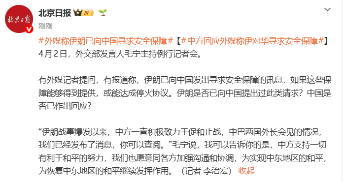 有外媒记者发问,有报说念称,伊朗已向中国发出寻求安全保险的讯息,若是这些保险省略取得提供,或能达成寝兵条约。伊朗是否已向中国冷漠过此类肯求?中国事否已作出回话?