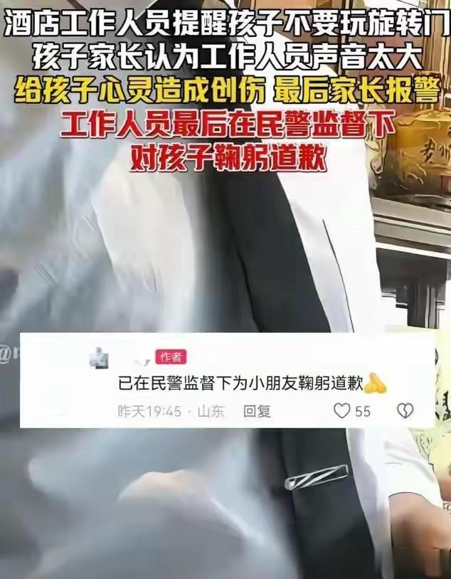 民警赶到现场后,本合计能秉公处治,没猜想为了快速平息闹剧,竟让彻底没作念错的前台,马上给4岁孩子鞠躬三次说念歉。这操作径直看懵全网,合着守划定、尽责责的东说念主,反倒要向失责的家长俯首?这不是明摆着滋长邪门歪道吗?那时不少网友怒喷,这那儿是归并,分明是寒了好东说念主的心!