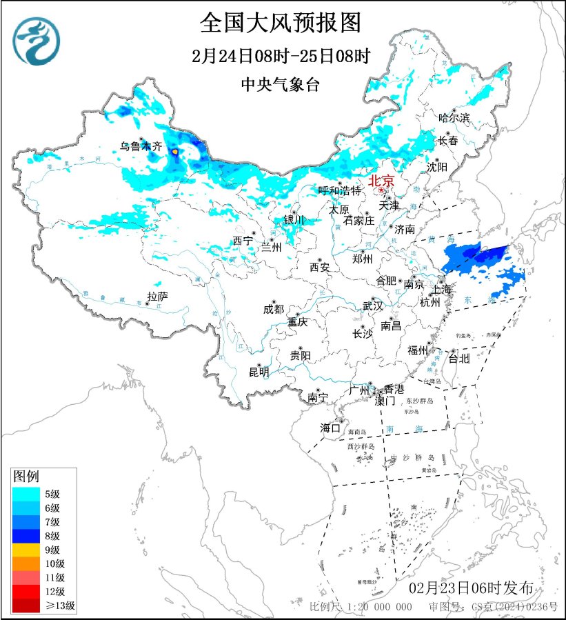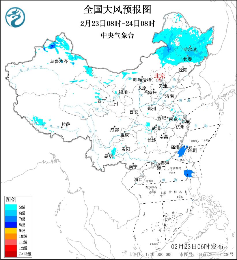 中央表象台2月23日06时不时发布大风蓝色预警: