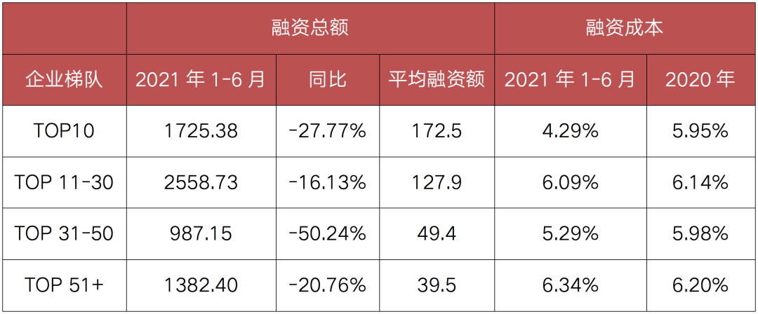 据CRIC统计,2021年上半年100家典型房企的融资额为6090亿元,同比下落34%,环比下落29%。中型房企融资鸿沟下落尤为彰着,部分企业融资鸿沟约即是腰斩。