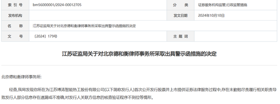 还有前边提到的冲刺IPO失败的博涛热工,也值得一提。凭证江苏证监局2024年10月10日发布的公告提到,针对北京德和衡讼师事务地方为博涛热工初度公开辟行股票并上市经过中,未能勉力守法实行关系职责,导致刊行东说念主部分信息存在遗漏或不准确,且对刊行东说念主关联方信息的核检验证法子不到位,江苏证监局决定对其给与出具警示函的监督解决纪律。