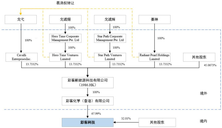 其中,Radiant Pearl BVI、Hero Time BVI和Star Path BVI全部股份的法定所有东说念主隔离为戈弋妃耦綦琳、女儿戈诚煜和女儿戈诚辉。笔据2019年6月24日签署的《表决权转让契据》及2022年6月28日签署的《表决权转让契据澄清契据》,綦琳、戈诚煜、戈诚辉将所合手彩客新动力表决权不能拆除、不能变更且无期限地奉求给戈弋哄骗。