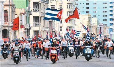 当地时候四月二日,大家在古巴哈瓦那海滨正途插手反对帝国主见的游行行动。